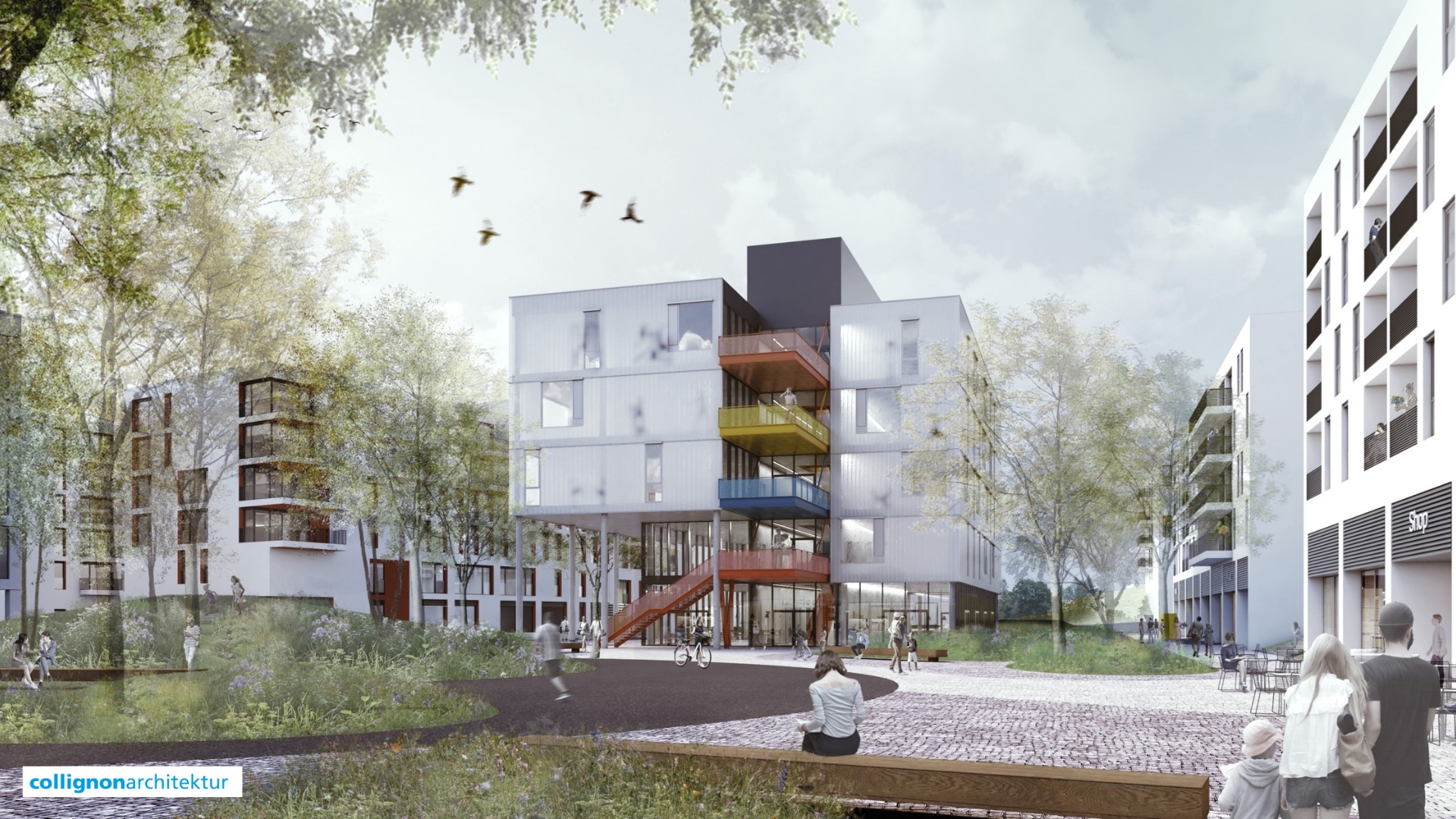 Das Architekturbüro Collignon entwarf ein Konzept, das auf eine individuelle Gestaltung der Gebäude setzt. Jedes Wohngebäude erhält eine eigene Fassadenoptik: Zum Einsatz kommen Keramikfliesen, glatte und strukturierte Putzflächen, Metall-Glasfassaden mit teilweise transluzenten Elementen sowie Holzhybridfassaden. Diese Vielfalt sorgt für ein abwechslungsreiches und hochwertiges Erscheinungsbild des Quartiers. Aufgrund der geschossweise versetzten Fensterachsen sowie der Kombination von Balkonen und Loggien entsteht ein lebendiger Eindruck der Fassaden.